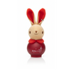 Design : Flacon rouge avec un lapin en peluche beige, oreilles rouges et nœud, créant un look ludique et mignon.